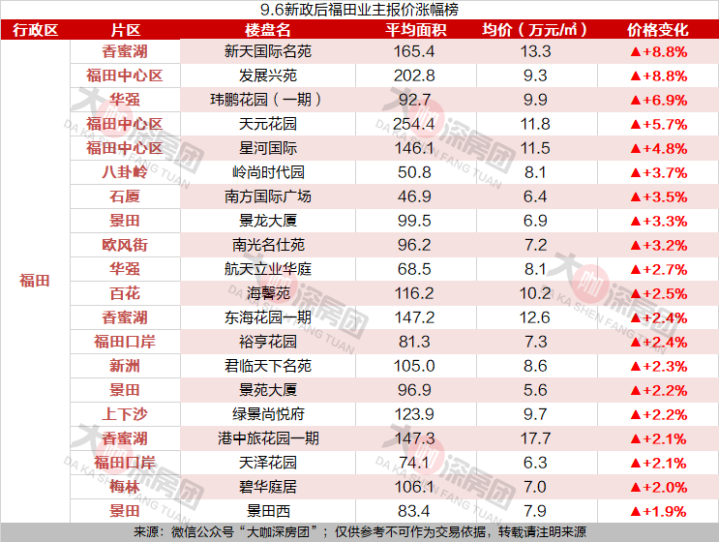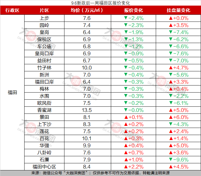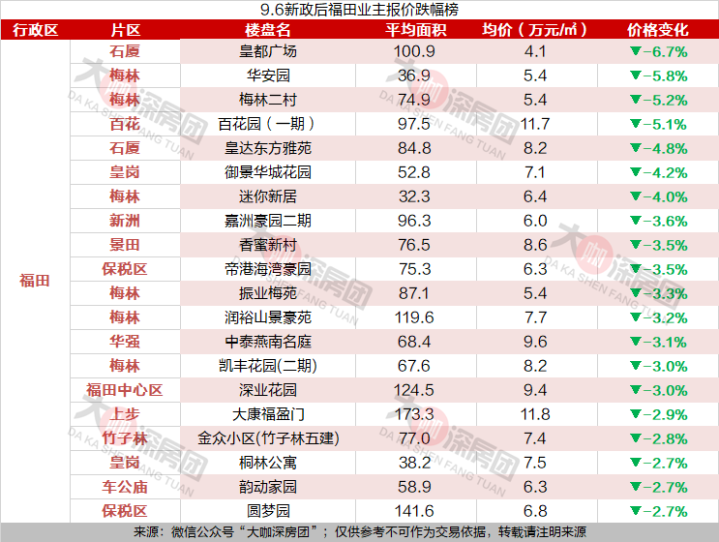 新政出台后,福田区跌幅榜的范围在2.7-6.7%。